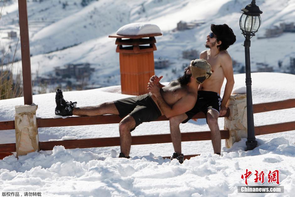 当地时间2015年1月11日,中东地区遭暴风雪袭击。图为叙利亚南部城市Jizeen遭暴风雪袭击,民众在雪后享受阳光。