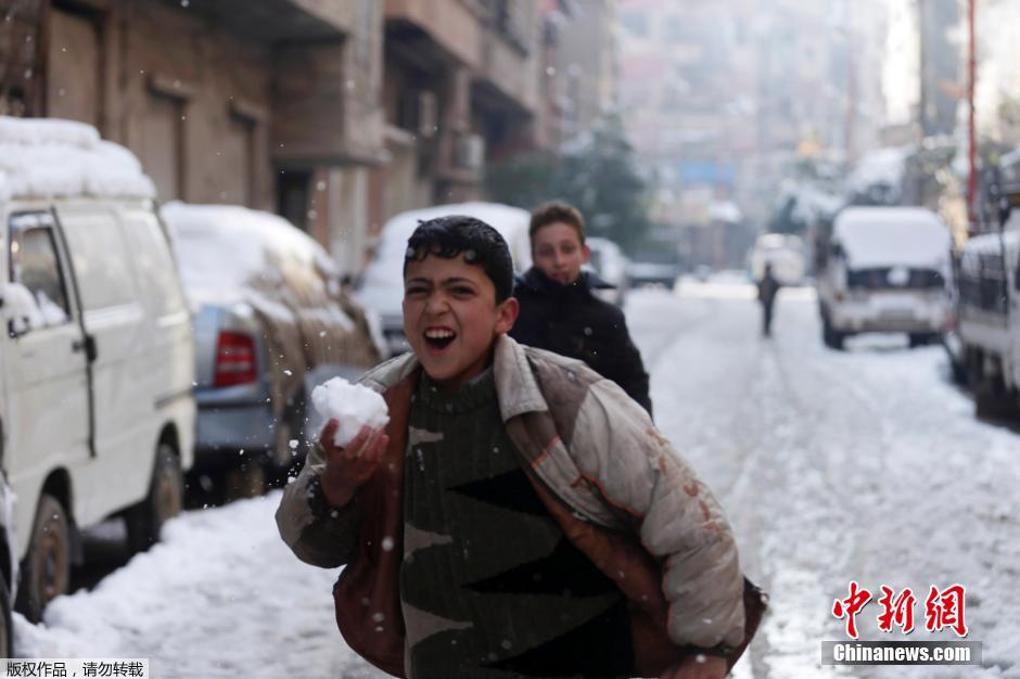 当地时间2015年1月11日,中东地区遭暴风雪袭击。图为叙利亚大巴士革附近的Douma,孩子在玩雪。