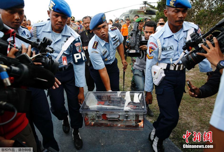 印尼搜救中心负责人苏利斯提约1月12日对外宣布,亚航失事客机的一个黑匣子已于当天上午被打捞出水。图为加里曼丹空军基地内举行的黑匣子移交。