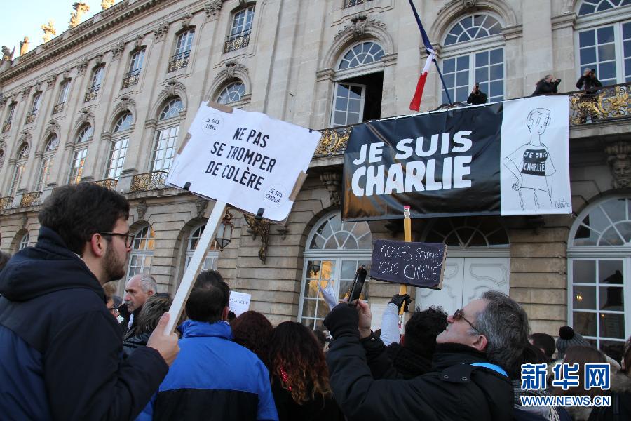 1月11日,在法国南锡市,游行队伍行进到市政厅广场,市政厅大厦悬挂“我是沙尔利”的大幅标语。当日下午,位于法国东北部洛林地区的主要城市南锡举行了反恐大游行。参加游行人数超过5万,达到全市人口的一半以上。 新华社记者卢苏燕摄