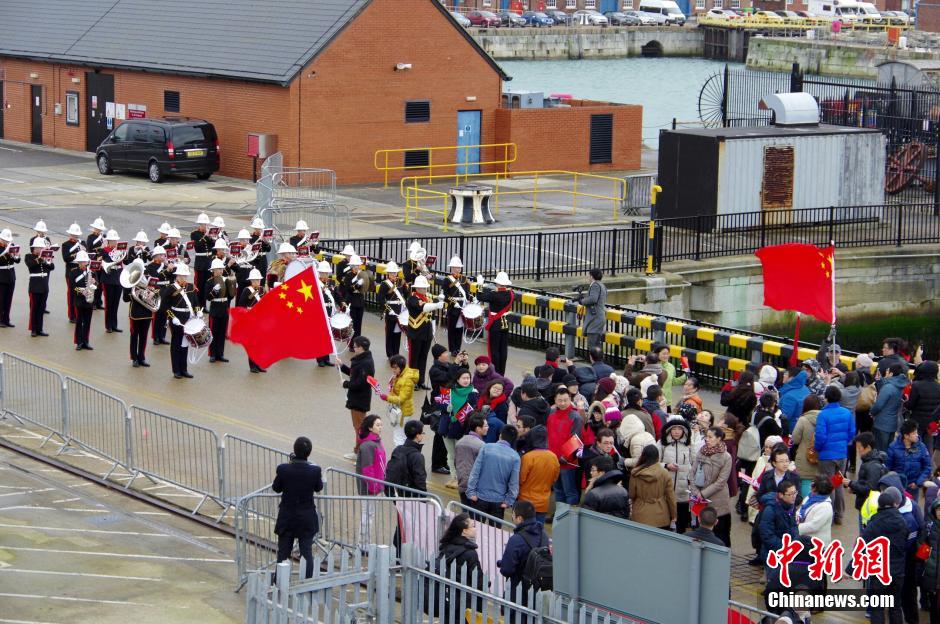 当地时间1月12日上午,英国朴茨茅斯军港彩旗飘拂、军乐嘹亮,中国海军第十八批护航编队长白山舰、运城舰和巢湖舰抵达英国进行友好访问。上午10时许,中国英国大使刘晓明及使馆工作人员、华人华侨、中资机构和留学生代表及英国海军官兵800余人到码头迎接。欢迎仪式结束后,刘晓明大使、英海军司令部代表约翰斯通少将、朴茨茅斯基地司令杰里米·里格比准将登上长白山舰,与编队指挥员、南海舰队副参谋长张传书少将会面。中新社发 甘俊 摄