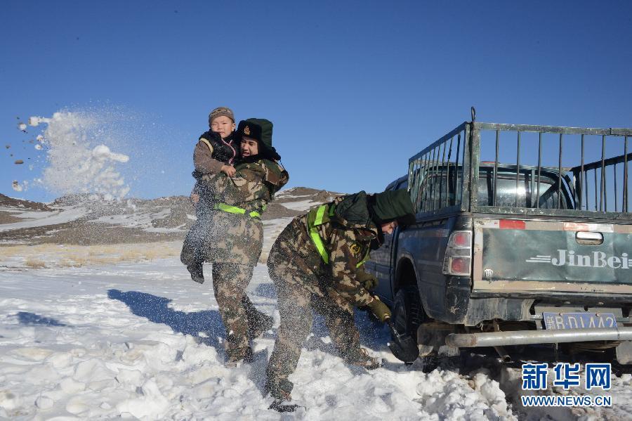 1月12日,边防战士将一名小朋友从被困车辆中抱出,转移到警车上。当日,3名牧民在新疆木垒县大黄水泉牧场遭遇风吹雪天气。在零下25摄氏度的低温和8级大风中,牧民所驾车辆陷入深深的积雪中无法动弹,情况危急。接到报警后,武警新疆边防总队大黄水泉边防派出所官兵迅速出动警力,携带工具赶往事发地救援,最终将被困群众连同车辆成功解救,脱离险境。新华社发 韩广宁 摄 图片来源:新华网