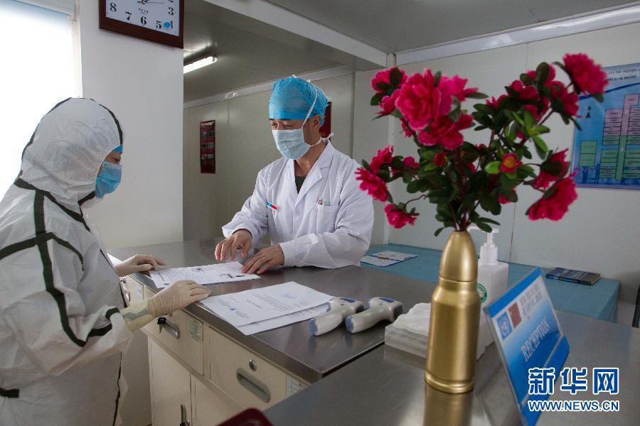 2014年12月31日,中国驻马里维和医疗分队艾纯华医生(右)与护士交接。马里出现埃博拉疫情后,医疗分队所在的战区二级医院采取措施,前台护士接诊病人时需身着全套防护服。新华社记者李京摄 图片来源:新华网