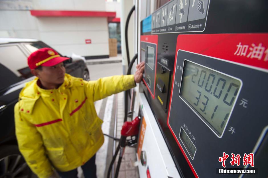 1月12日,山西太原,一加油站工作人员正在为车辆加油。当日,中国国家发改委决定将汽、柴油价格每吨分别降低180元和230元,预测到零售价格90号汽油和0号柴油(全国平均)每升分别降低0.13元和0.20元调价执行时间是1月13日零时。中新社发 张云 摄