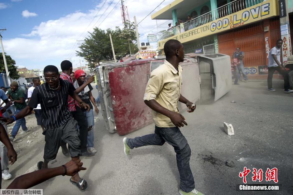 当地时间2015年1月11日,海地太子港,抗议者举行示威活动,焚烧轮胎和路障,推翻车辆,要求现任总统马尔泰利辞职。
