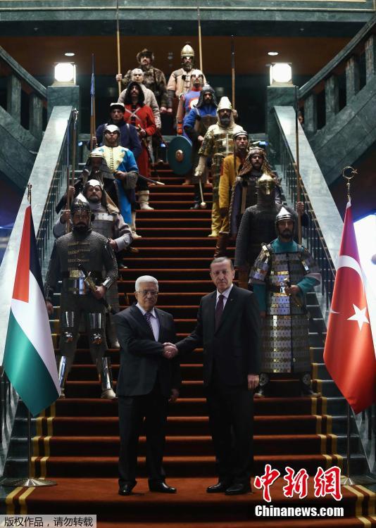 当地时间2015年1月12日,土耳其安卡拉,土耳其总统埃尔多安会晤到访的巴勒斯坦领导人阿巴斯。代表土耳其16州的士兵穿着传统军服参加欢迎仪式。
