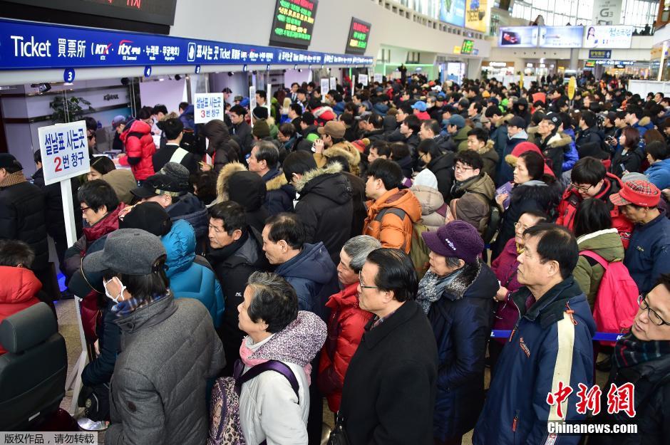当地时间2015年1月13日,韩国首尔,韩国“春运”火车票预售开始,首尔火车站人山人海,民众排队购买火车票场面火爆。据悉,韩国和中国的春运情形一样,春节前也是火车票和机票一票难求,很多人必须通宵排队买票。韩国人讲究年三十之前必须回家探亲。每年除夕之前,就会出现一幅数千万大军流动的回乡场面。
