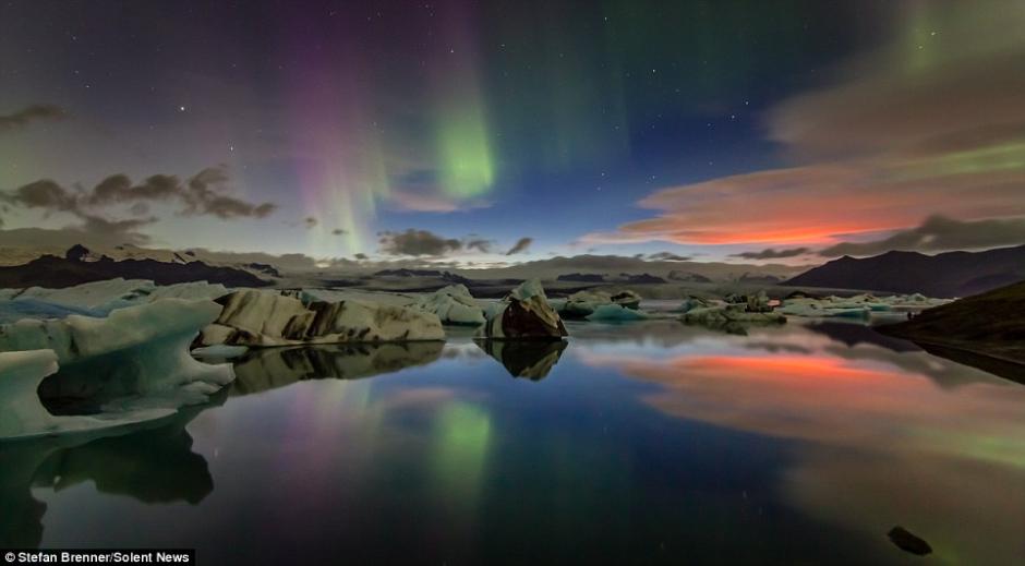 据英国《每日邮报》近日报道,冰岛,Holuhraun火山喷发造成的火光与北极光交相辉映,天空呈现五彩斑斓的色彩。31岁的软件工程师Stefan Brenner将这自然奇观成功定格。(网页截图)