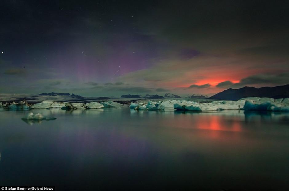 据英国《每日邮报》近日报道,冰岛,Holuhraun火山喷发造成的火光与北极光交相辉映,天空呈现五彩斑斓的色彩。31岁的软件工程师Stefan Brenner将这自然奇观成功定格。(网页截图)