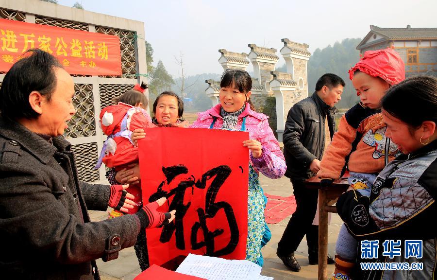 1月13日,在四川省广安市华蓥山区阳和镇偏岩子新村,书法家为刚从地质灾害区搬到新居的村民赠送现场撰写的“福”字门贴。连日来,四川省广安市、华蓥市书法家协会参加“我们的中国梦---中国书法家送万‘福’进万家公益活动”的书法家们,组成小分队前往华蓥山区,走村串户为农家义务撰写春联和“福”、“春”等门贴,将“福”送到乡亲们手上。新华社发(邱海鹰 摄)