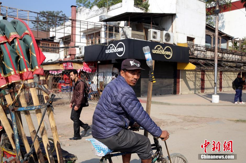 图为1月13日一位人力三轮车夫在加德满都街头接客,该市机动车辆被禁止上路行驶。 符永康 摄