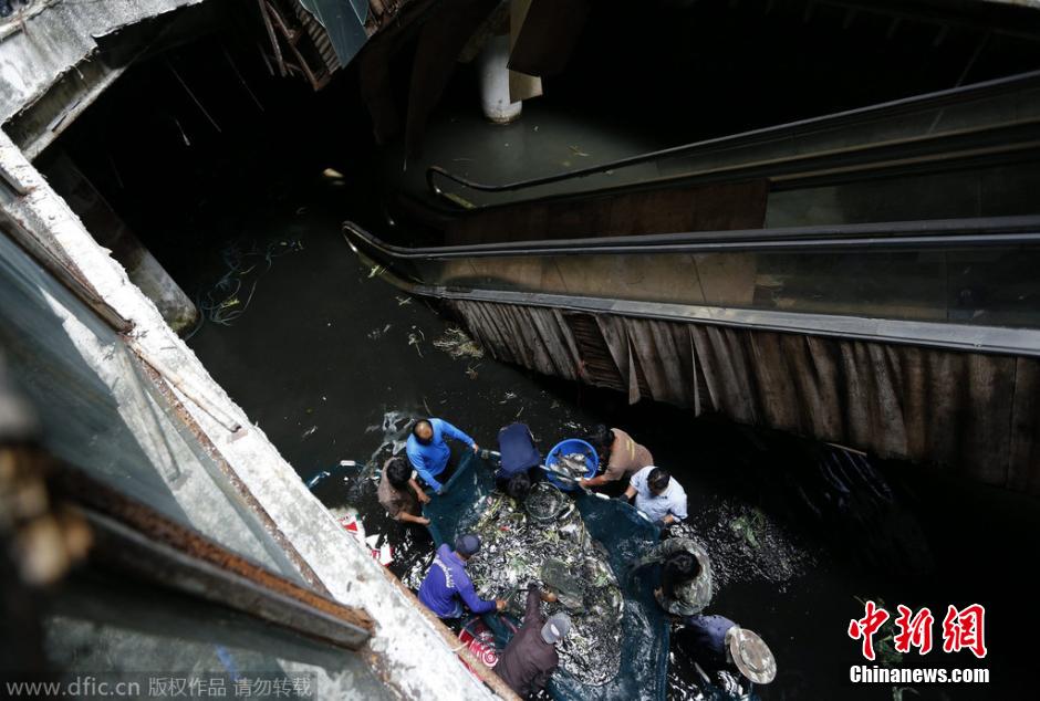 当地时间2015年1月13日,泰国曼谷,工作人员在一家废弃商场的地下室内捕鱼。他们将大量罗非鱼、低眼巨鲶以及鲤鱼等鱼类从新世界购物中心内的水塘中转移出去。这座即将被拆除的商场于1997年因违建而被关闭,在积蓄了大量雨水之后成为了鱼类的家园。