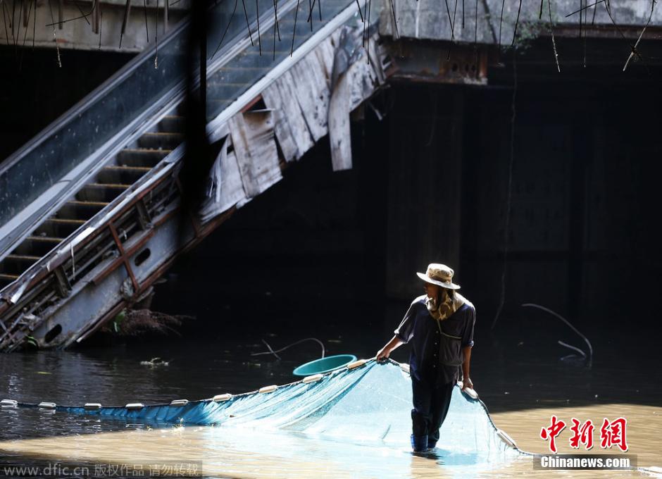 当地时间2015年1月13日,泰国曼谷,工作人员在一家废弃商场的地下室内捕鱼。他们将大量罗非鱼、低眼巨鲶以及鲤鱼等鱼类从新世界购物中心内的水塘中转移出去。这座即将被拆除的商场于1997年因违建而被关闭,在积蓄了大量雨水之后成为了鱼类的家园。