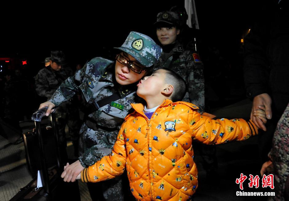 1月13日晚间,中国人民解放军第二批援利医疗队第一梯队的75名官兵从成都双流国际机场出发飞赴利比里亚,在利比里亚的埃博拉出血热诊疗中心协助抗击仍在该国肆虐的埃博拉出血热疫情。图为援利抗埃医疗队出征亲人相送。 安源 摄