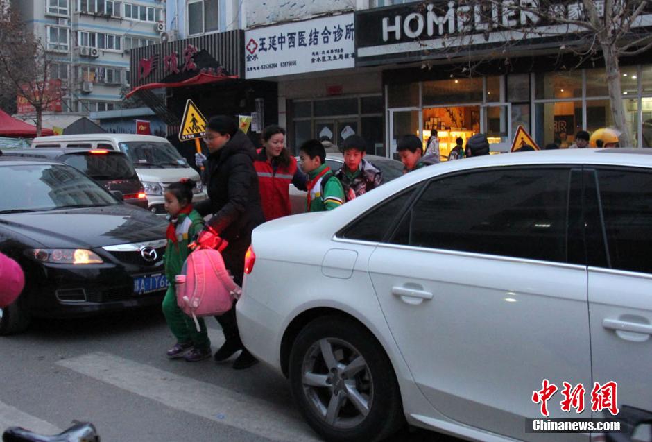 近日,在郑州中方园双语小学门前,每天上学和放学的时间,都会有身穿红色马甲手拿警示牌的家长出现在路口,示意车辆慢行,守护小学生安全过马路。汤荔 摄