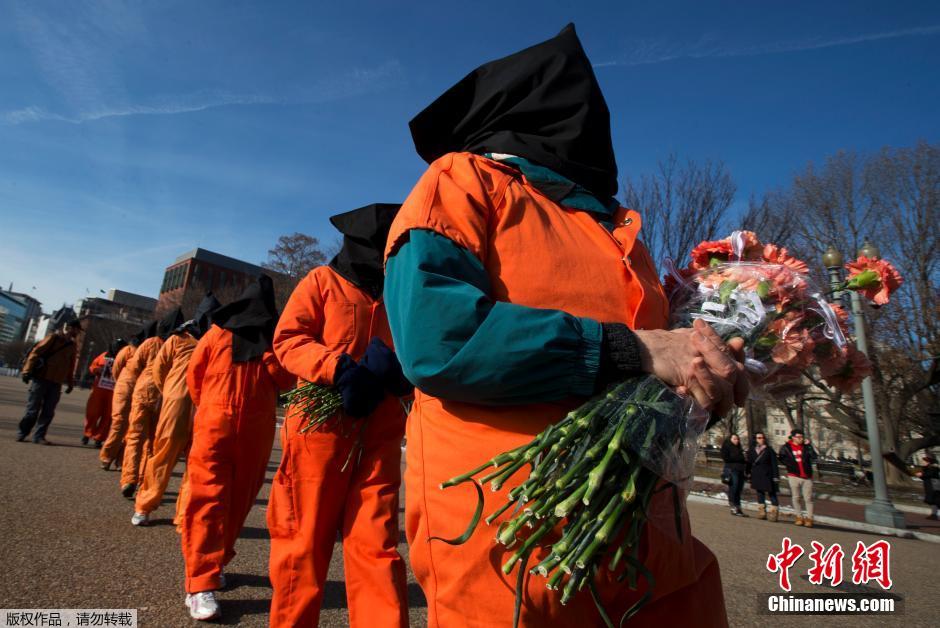 近日,美国民众聚集在白宫门前进行抗议活动,要求美国政府兑现关闭关塔那摩监狱的承诺。1月11日是关塔那摩监狱关押第一批囚犯的13周年,许多民间组织同时在白宫发动大规模示威活动。抗议人群模仿关塔那摩监狱中囚犯的服饰,身着橙色囚服和黑色头套,一些人手举囚犯的照片,打出“关闭关塔那摩”“无限期的监禁是不公正”等横幅。