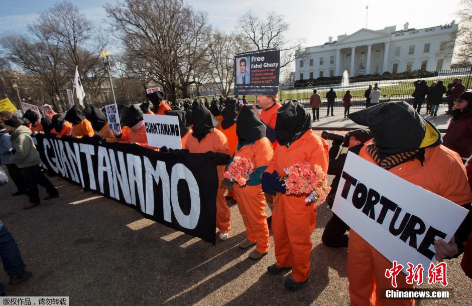 近日,美国民众聚集在白宫门前进行抗议活动,要求美国政府兑现关闭关塔那摩监狱的承诺。1月11日是关塔那摩监狱关押第一批囚犯的13周年,许多民间组织同时在白宫发动大规模示威活动。抗议人群模仿关塔那摩监狱中囚犯的服饰,身着橙色囚服和黑色头套,一些人手举囚犯的照片,打出“关闭关塔那摩”“无限期的监禁是不公正”等横幅。