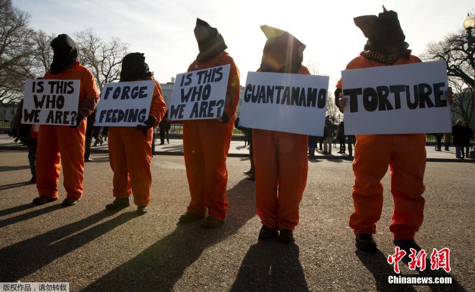 近日,美国民众聚集在白宫门前进行抗议活动,要求美国政府兑现关闭关塔那摩监狱的承诺。1月11日是关塔那摩监狱关押第一批囚犯的13周年,许多民间组织同时在白宫发动大规模示威活动。抗议人群模仿关塔那摩监狱中囚犯的服饰,身着橙色囚服和黑色头套,一些人手举囚犯的照片,打出“关闭关塔那摩”“无限期的监禁是不公正”等横幅。