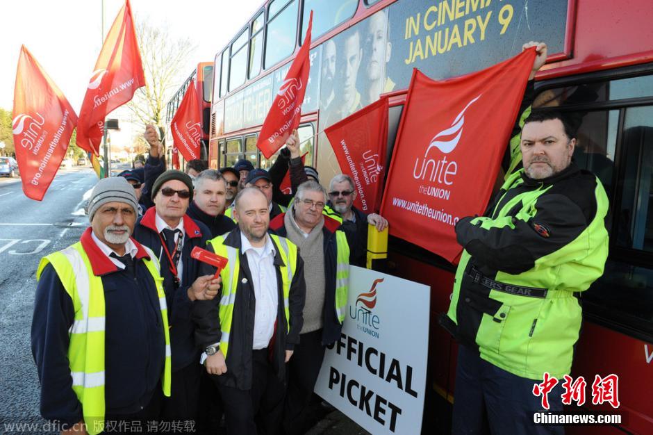 当地时间2015年1月13日,英国伦敦,约2.7万名公交员工参加24小时罢工行动,要求享受平等的薪酬待遇。此次活动由工会组织,伦敦交通局网站称,罢工期间公交运营服务将受到影响。