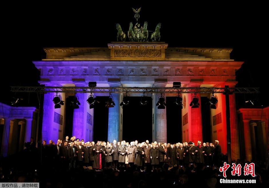 当地时间2015年1月13日,德国柏林,德国在勃兰登堡门前举行守夜活动悼念法国杂志社遇袭事件遇难者,德国总理默克尔、总统高克等政要和德国各界人士手挽手出席守夜仪式。