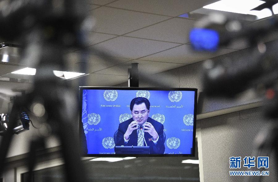 这是1月13日朝鲜常驻联合国副代表安明勋在纽约联合国总部举行记者会时现场转播的屏幕。当日,安明勋就美国政府拒绝朝方有条件暂停核试验提议回应说,如果美方需要了解该提议更多情况,朝方可以直接向美方进行解释。新华社记者牛晓雷摄