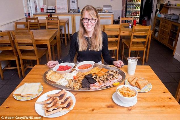 图为顾客Harriet Crawford与巨型早餐合影,该巨型早餐内含有6片熏肉、6根香肠、6个鸡蛋、2个鸡蛋饼、4份薯片和4份蘑菇,除此之外,还有6片黑布丁、6个土豆煎饼、一桶薯条、4个洋葱圈、4片烤面包、2片煎面包、半个烤番茄、2份豆子和2份西红柿。(网页截图)