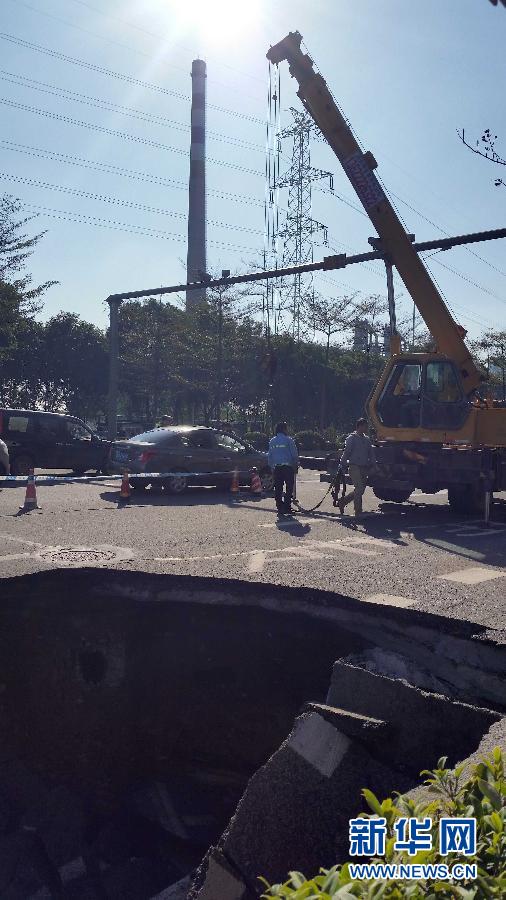 1月14日,广州科韵路“地陷”现场(手机拍摄)。当日上午,广州市科韵路上发生一处“地陷”,一辆小轿车陷在坑边缘。截至14日中午,该车已被拖出,事件未造成人员伤亡。 新华社记者 詹奕嘉摄