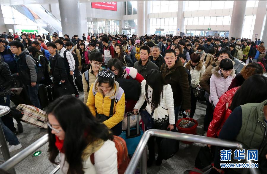 1月14日,旅客在安徽淮北火车站候车厅进站。随着寒假的到来,安徽淮北火车站迎来寒假大学生客流小高峰。 新华社发(万善朝 摄)
