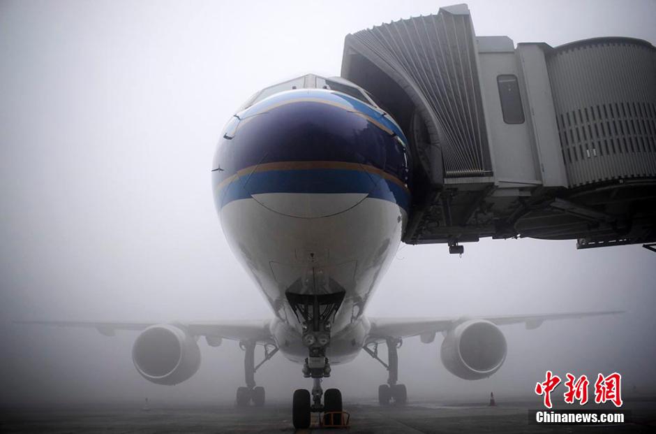 2015年1月14日清晨,浓重的雾气慢慢的向乌鲁木齐国际机场蔓延,很快机场停机坪及跑道就被浓雾“淹没”,能见度曾一度降至50米左右。截止记者发稿时,乌鲁木齐国际机场浓雾依然没有散去,能见度也达不到航班起降标准。据乌鲁木齐国际机场运行指挥室介绍,乌鲁木齐国际机场因冻雾天气影响,截至15:00出港已经起飞17班,出港延误84班,进港备降34班,返航1班,进出港共取消共40班,滞留旅客人数约9200人。图为大雾中被延误的航班。刘明晔 摄