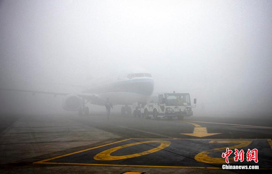 2015年1月14日清晨,浓重的雾气慢慢的向乌鲁木齐国际机场蔓延,很快机场停机坪及跑道就被浓雾“淹没”,能见度曾一度降至50米左右。截止记者发稿时,乌鲁木齐国际机场浓雾依然没有散去,能见度也达不到航班起降标准。据乌鲁木齐国际机场运行指挥室介绍,乌鲁木齐国际机场因冻雾天气影响,截至15:00出港已经起飞17班,出港延误84班,进港备降34班,返航1班,进出港共取消共40班,滞留旅客人数约9200人。图为一架客机完成除冰工作后,刚准备进入跑道起飞,大雾又蔓延过来,飞机只得再次拖回到停机位。张思维 摄