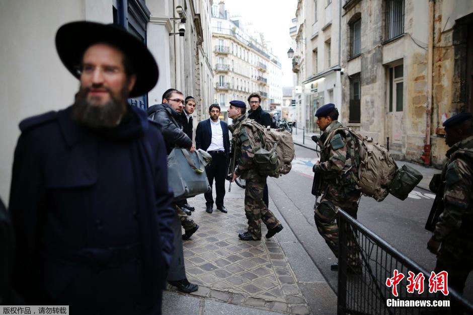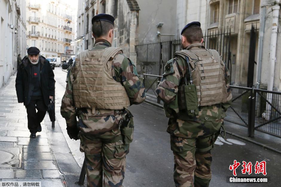 当地时间2015年1月14日,法国巴黎,法国士兵在一条通往犹太人机构的过道上加巡逻。法国仍维持最高级别的反恐警戒,约一万名士兵被部署在全国各“敏感区域”,另外还有5000名士兵在各个犹太人社区进行安全维护。