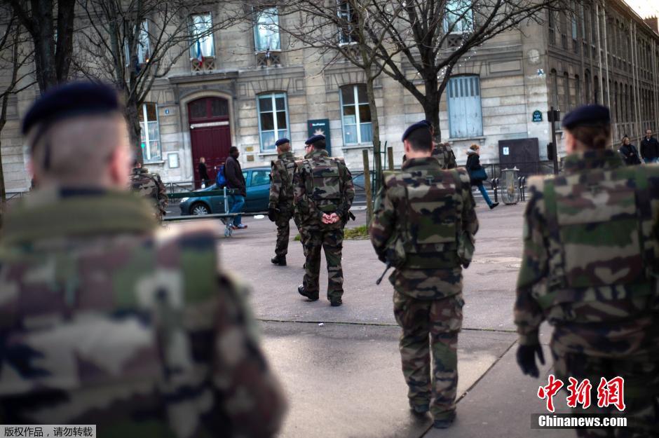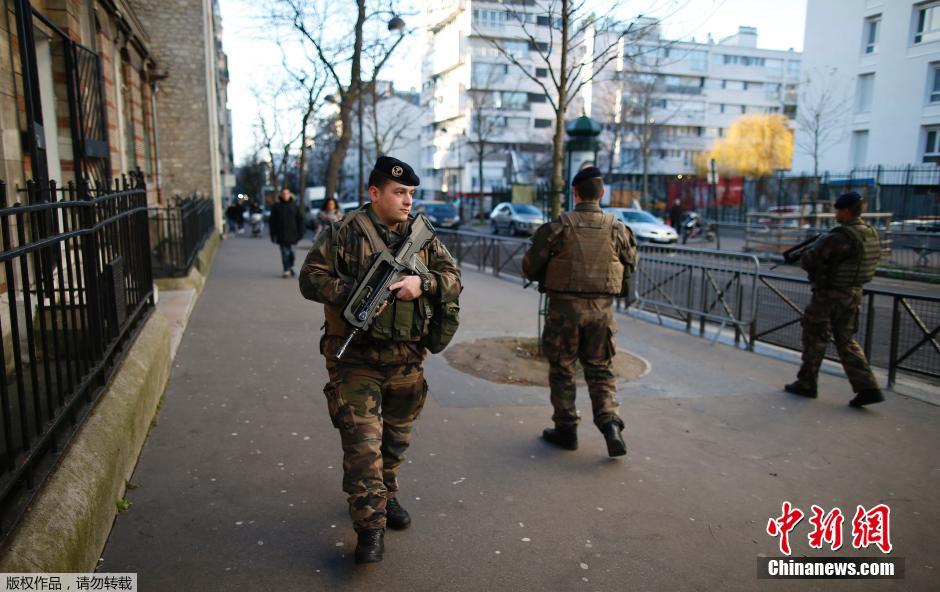 当地时间2015年1月14日,法国巴黎,两名法国士兵正在一个犹太人学校附近进行巡逻。法国仍维持最高级别的反恐警戒,约一万名士兵被部署在全国各“敏感区域”,另外还有5000名士兵在各个犹太人社区进行安全维护。