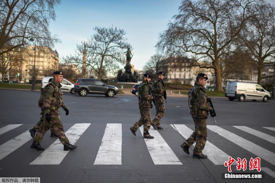 当地时间2015年1月14日,法国巴黎,士兵在民族广场加强巡逻。法国仍维持最高级别的反恐警戒,约一万名士兵被部署在全国各“敏感区域”,另有5千名士兵在各个犹太人社区进行安全维护。