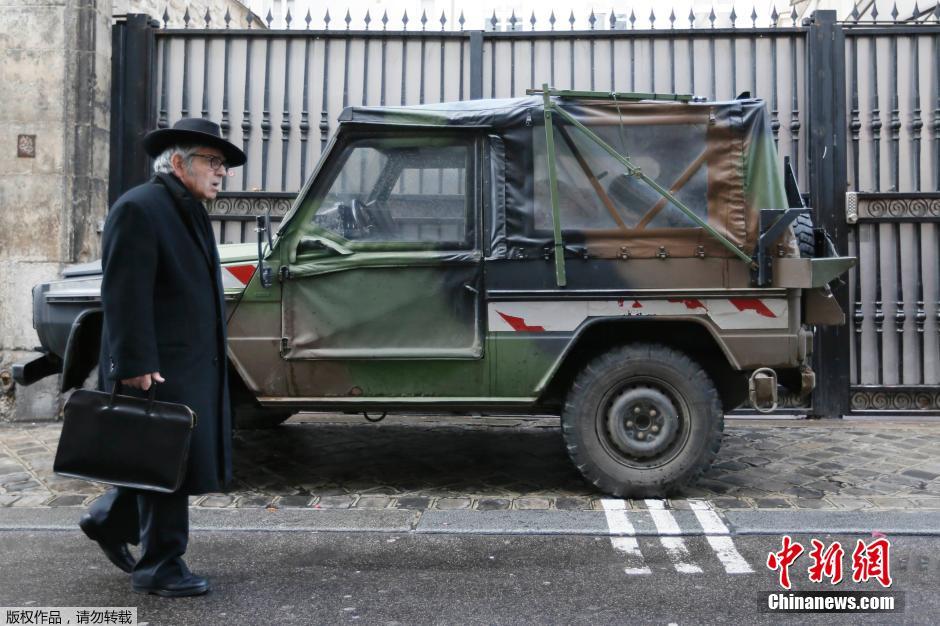 当地时间2015年1月14日,法国巴黎,一辆军用吉普车停在一个犹太人社区,附近是一个宗教学校。法国仍维持最高级别的反恐警戒,约一万名士兵被部署在全国各“敏感区域”,另外还有5000名士兵在各个犹太人社区进行安全维护。