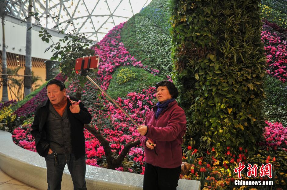 1月14日,昆明“花之城”旅游商业综合体内,游客在花园内自拍。据了解,该项目整个花园收集了上千种来自世界各地的珍稀花卉品种,布展耗用玫瑰、兰花、山茶等珍贵花卉植物近800万株。中新社发 任东 摄