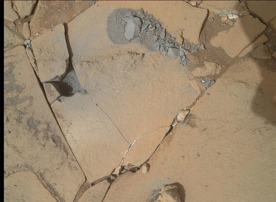 图为在“好奇”号钻孔过程中拍摄的照片,照片中可见钻孔后产生的浅灰碎石,以及岩石因钻孔震动所产生的裂缝。(图片来源:美国宇航局)
