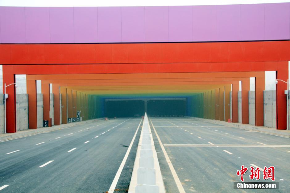 2015年1月15日,河南省郑州市中牟县郑开大道与S223省道交叉口的“彩虹隧道”吸引路人目光。该彩虹隧道长约400米,由三段组成,中间部分和普通隧道一样,南北两端为彩虹颜色。其中,隧道南端44组遮阳板,北端40组,两边都是12种颜色,最外面为紫色,一直过渡到最里面的蓝色。据现场施工人员介绍,这是国内第一条也是唯一一条彩虹隧道,投资上亿元。目前,彩虹隧道还未完全建成,整体完工后将选择合适时机通车。中新社发 冯磊 摄