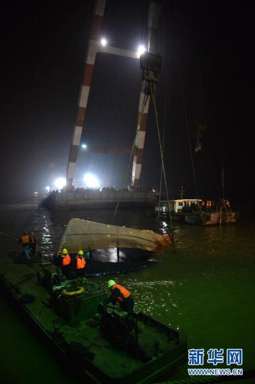 图为1月16日凌晨,工作人员在沉船现场进行船体打捞作业。图片来源:新华网 沈鹏 摄
