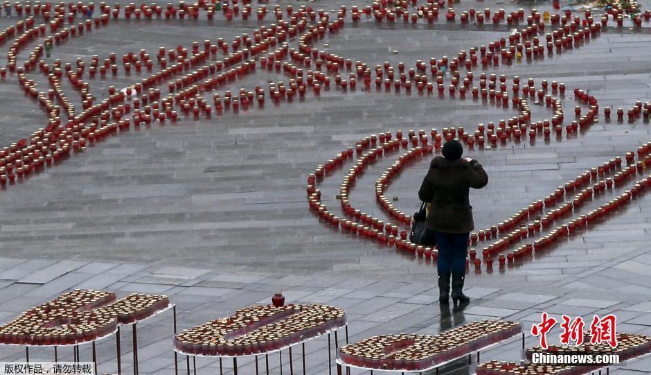 当地时间2015年1月15日,乌克兰基辅,乌克兰独立广场上一位女子为长途客车遭火箭弹袭击遇难者致哀。