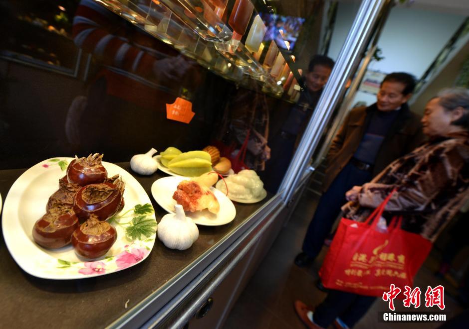 1月16日,福州一展馆内,鸭肉、猪腿、鸡肉、白菜等,由石头雕刻创作而成的一道道美食吸引了众多市民及外地游客前来观展。参观者如不用手触摸,很难分辨真伪,几可乱真。 中新社发 张斌 摄