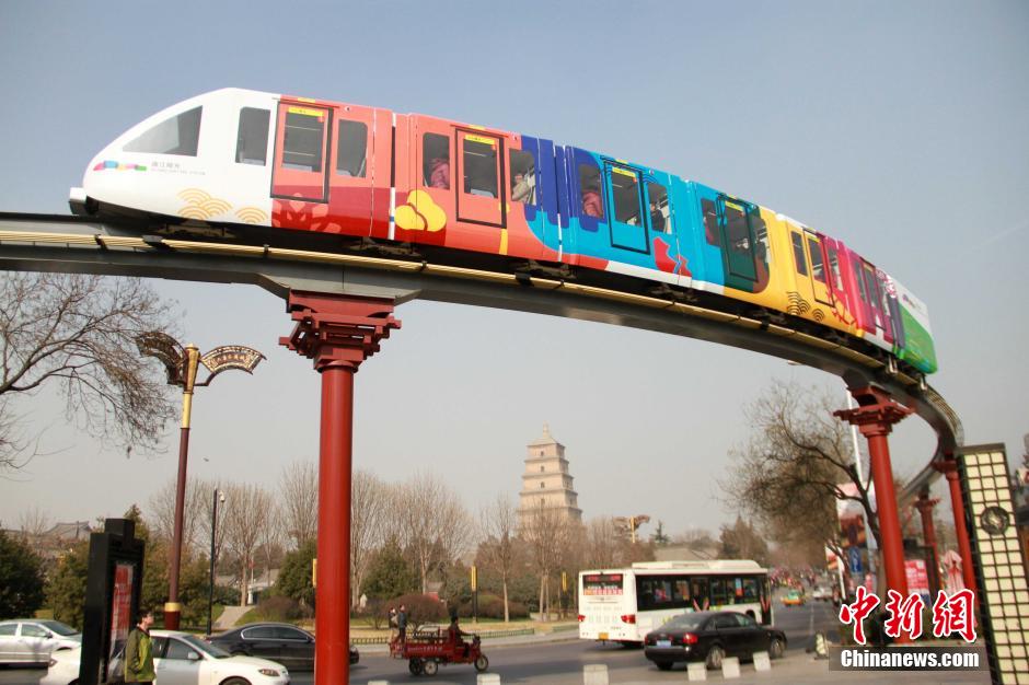 1月16日,西安曲江观光轻轨开通试运行,此间民众体验轻轨“首秀”。该轻轨是曲江国家5A级景区建设的旅游观光配套项目,线路全长9.5公里,设11个车站,途径中国佛教法相唯识宗(法相宗)的祖庭大慈恩寺,2014年列入《世界遗产名录》的唐高僧玄奘藏经处唐代大雁塔等著名古迹,与大雁塔“擦肩而过”。列车运行速度为每小时10到15公里,一趟列车最多载客35人。图为轻轨列车与唐代大雁塔“擦肩而过”。 张一辰 摄