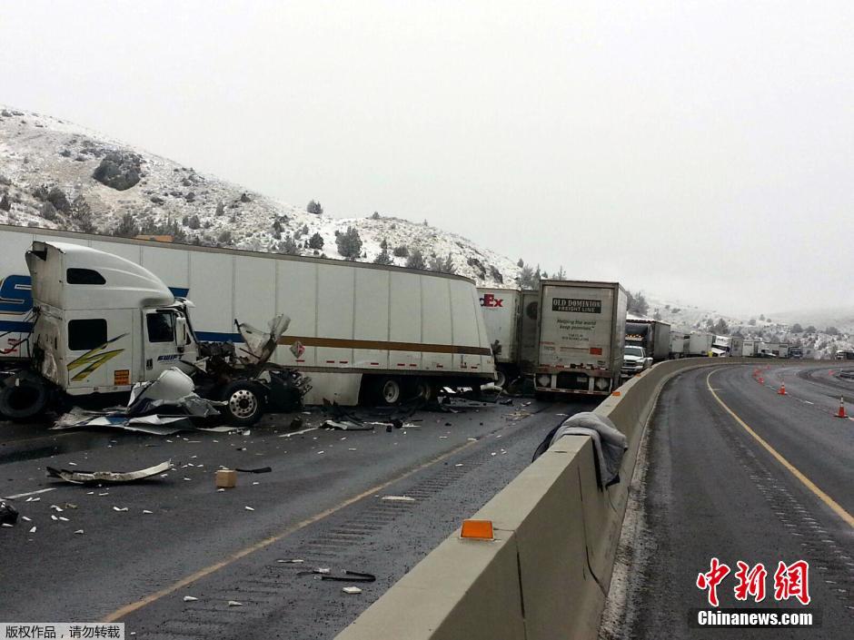 当地时间2015年1月17日,一股致命的“闪冻”风暴正席卷了宾州、新泽西和纽约的大部分地区,造成大量州际公路交通堵塞,图为俄勒冈贝克城附近的州际公路84号上,超过12辆拖车在冰滑路面撞车,导致12人受伤。