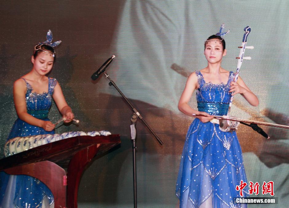 1月18日,第三届(2014)中国工艺美术收藏年会在北京隆重举行,来自江西景德镇古窑民俗博览区的瓷乐队成为年会上的一大亮点。这支瓷乐队所用的全部乐器都是景德镇制造的瓷器,堪称中国一绝,世界首创。他们现场演奏的开场曲目《花好月圆》《茉莉花》悠扬婉转、清新悦耳,一下就让现场来宾如痴如醉,回味无穷。中新网记者 杨彦宇 摄