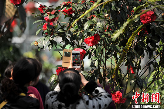 1月21日,以“神州茶花·秀甲天下”为主题的第九届中国茶花博览会正在云南昆明举行。正当北方大部分地区气候寒冷,银装素裹之时,南方的茶花却迎来了盛花期,盛放的茶花吸引了大量游客,纷纷拿出“长枪短炮”,拍下茶花最美的风貌。中新社发 任东 摄