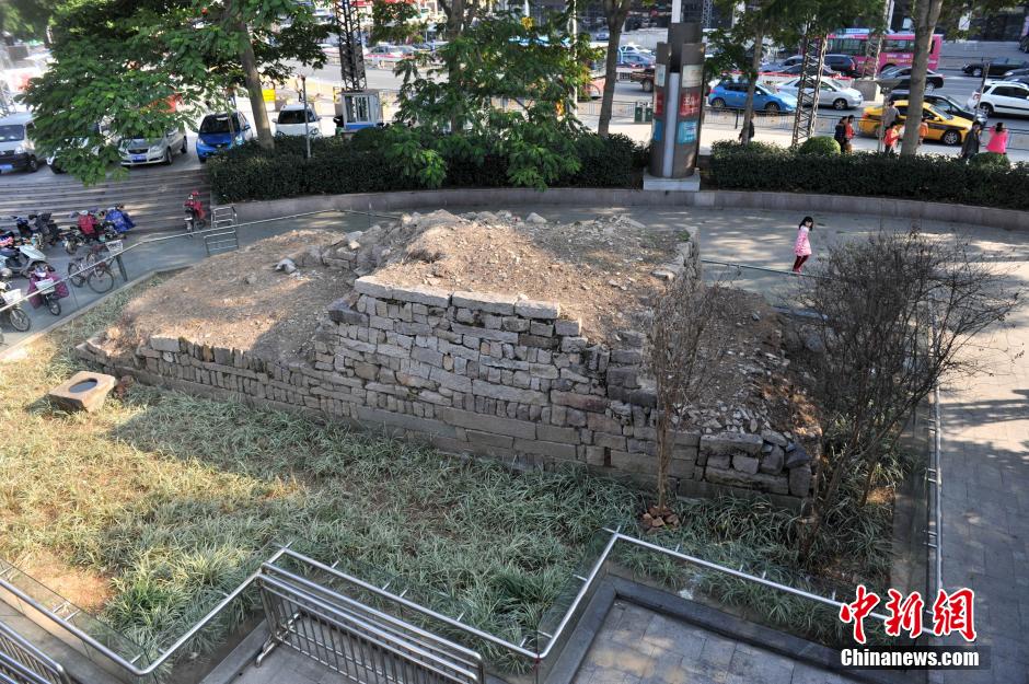 1月21日,民众从明代古城墙前经过。当日,位于福州闹市区的明代乌石山麓明代古城墙,在历时2个多月的修复完工后正式亮相,这段拥有600多年历史的古城墙向世人揭开了神秘的面纱,遗址长约15米,城墙分上下两层,每层1米多高,其中第二层只剩半堵墙。中新社发 吕明 摄