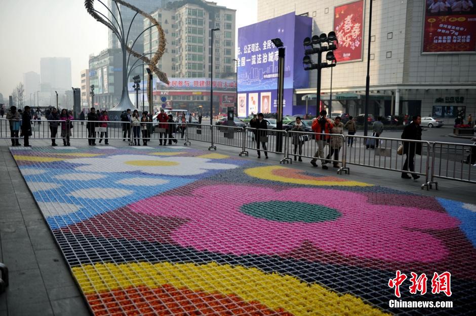 图为糖果“地毯”吸引过往民众拍照。 刘忠俊 摄