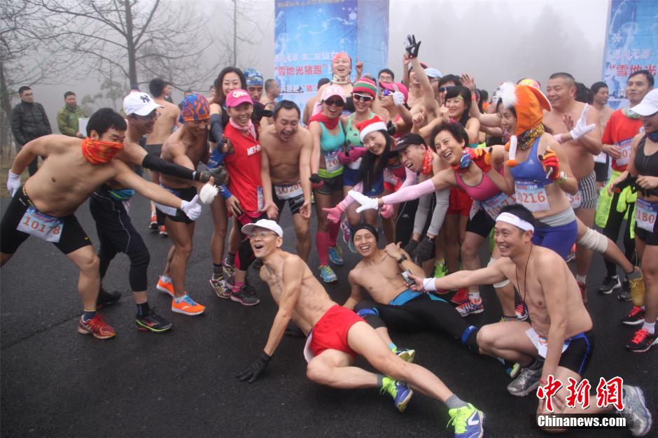 1月24日,重庆仙女山户外“光猪跑”比赛吸引近300名跑步爱好者仅穿内衣,在低温环境下分别跑完5公里和10公里两种赛段。戴璐 摄