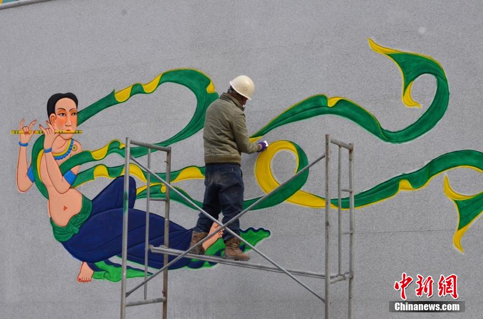 甘肃省会兰州市城区主要路段天水路实施了最大规模的交通下穿工程,隧道将于春节前完工通车。令当地居民眼前一亮的是,隧道敞开段的墙壁上,敦煌壁画“飞天”彩绘刻描其中。施工方告诉记者,在彩绘的最外层采取了封蜡工艺,确保色彩鲜艳明亮,在10年之内不会褪色。这条隧道,共绘有16幅造型各异的飞天仕女和祥云莲花等图案。图为1月24日,兰州天水路地下通道敞开段,工匠们正用心雕琢“飞天”壁画。陈求隆 摄