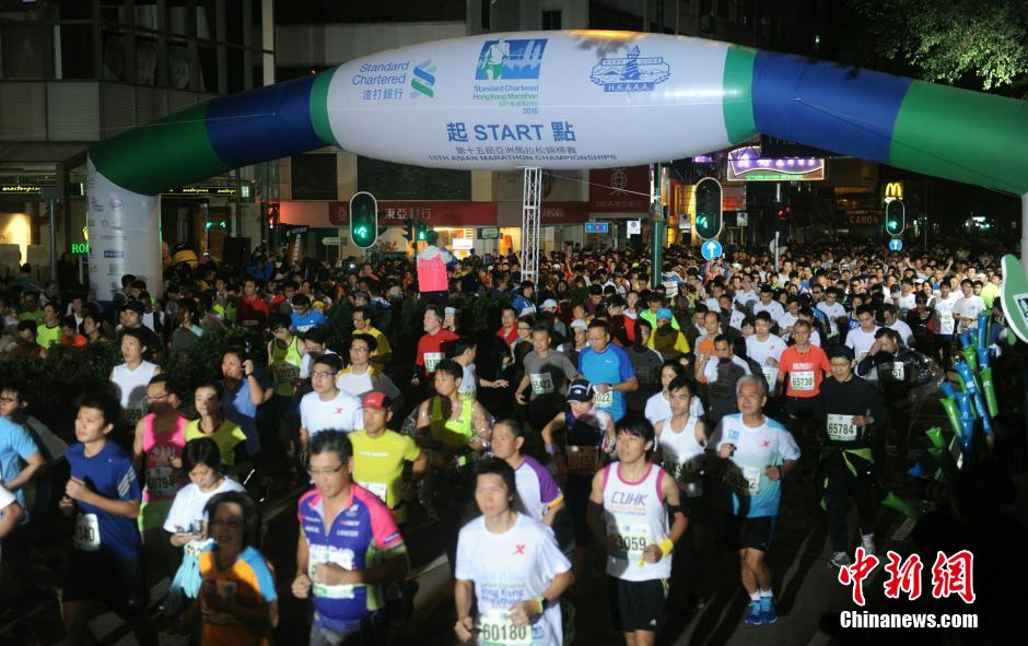 1月25日,一年一度的香港马拉松赛,全马及半马赛事分別在尖沙咀弥敦道起跑。中新社发 谭达明 摄