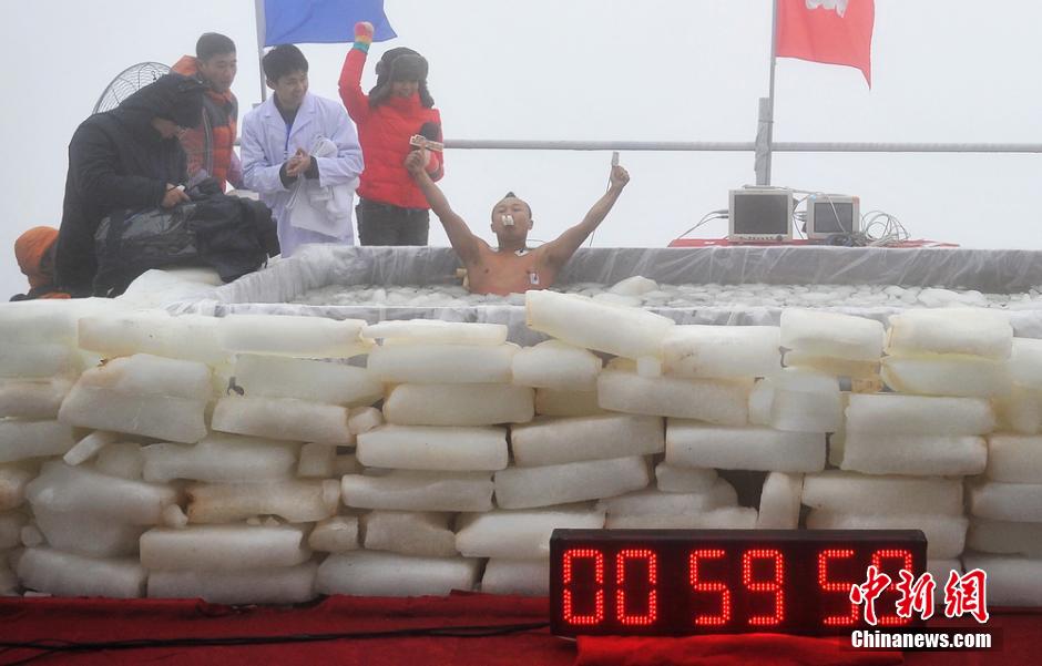 1月25日,来自湘西的选手火娃历经60分钟战胜黑龙江的金松浩。当日,2015“冰冻活人”之泡冰水大挑战在1518米的湖南张家界天门山云梦仙顶上演。6位民间达人躺在冰块砌成的大冰池里,同时还要经受吃冰棍、抱冰砖、吹电风扇等极限挑战,坚持时间最长者获最终冠军。杨华峰 摄
